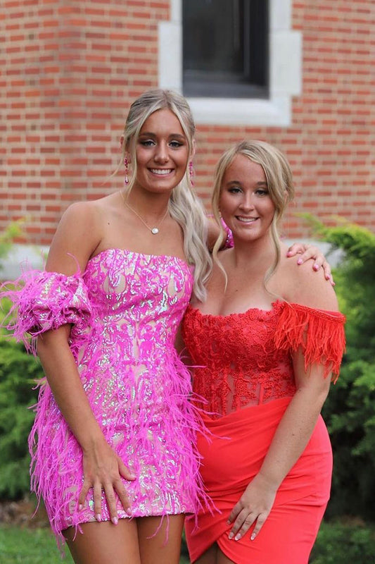 Cute Bodycon Off the Shoulder Pink Sequins Homecoming Dresses with Feather LD070606