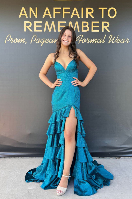 Elegant Sheath V-Neck Peacock Blue Satin Prom Dress with Beading and Tiered Detail