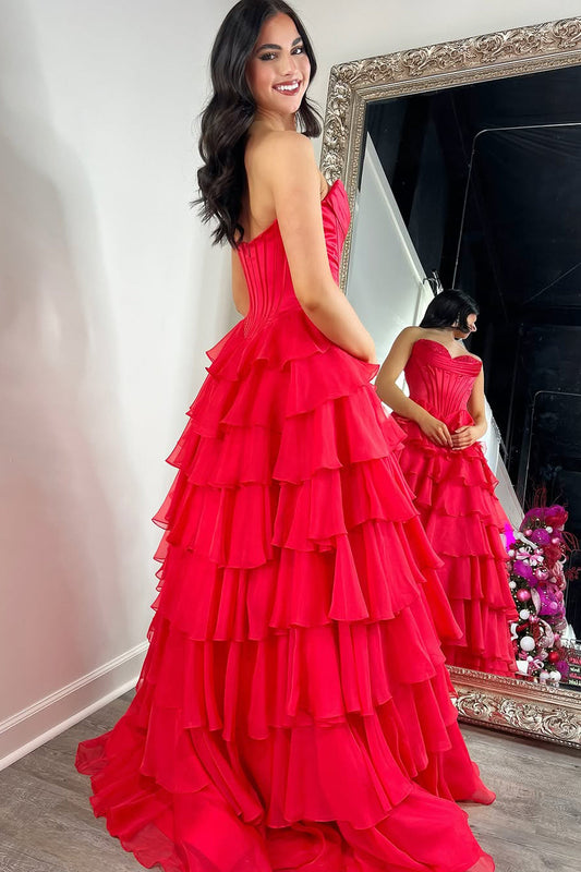 Cute A-Line Sweetheart Red Chiffon Prom Dress with Tiered Skirt and Slit