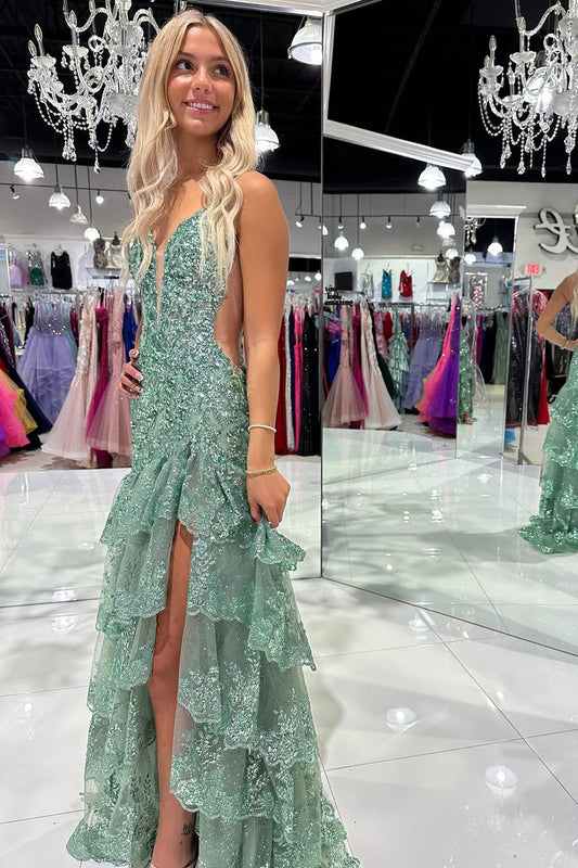 Gorgeous Sheath V-Neck Sage Green Prom Dress with Appliques