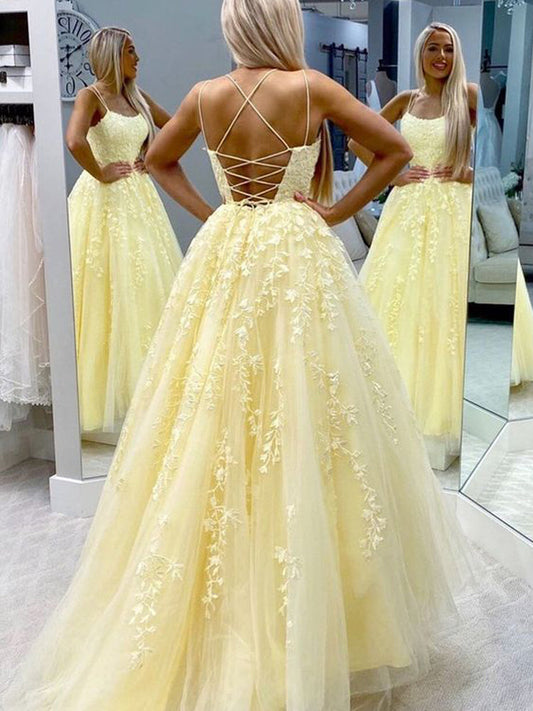 Elegant Light Yellow A-Line Tulle Prom Dress with Spaghetti Straps, Boat Neck, and Lace