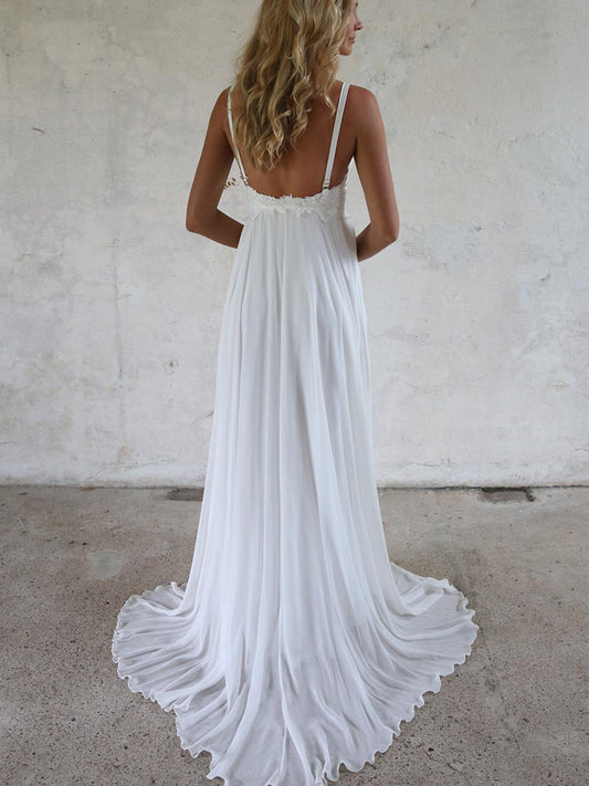 Glamorous White Sheath Chiffon Prom Dress with Spaghetti Straps, Sweetheart Neck, and Lace