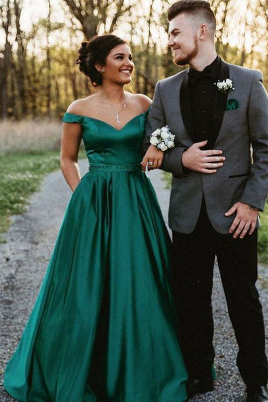 Glamorous A-Line Satin Ball Gown Prom Dress with Off-the-Shoulder Design and Beaded Belt