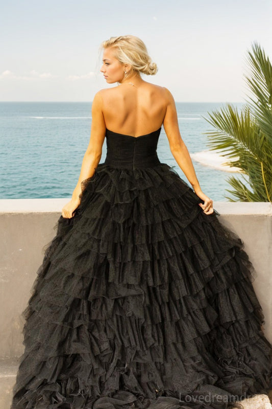 Elegant A line Strapiess Tulle Prom Dress with Lace and Tiered lD102311