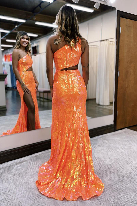 Cute Mermaid One Shoulder Orange Sequins Long Prom Dresses with Slit LD070820