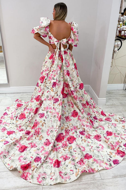 CuteA Line Floral Printed Puff Sleeves Prom Dresses with Slit LD062566