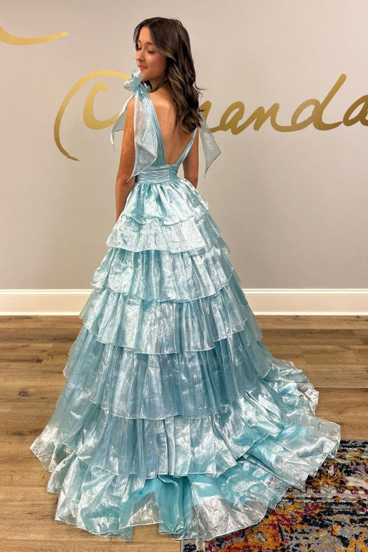 Cute Ball Gown V Neck Organza Ruffle Tiered Prom Dress with Bow LD062572