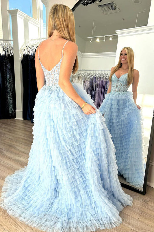 Cute A Line V Neck Light Blue Tiered Tulle Long Prom Dresses LD062562