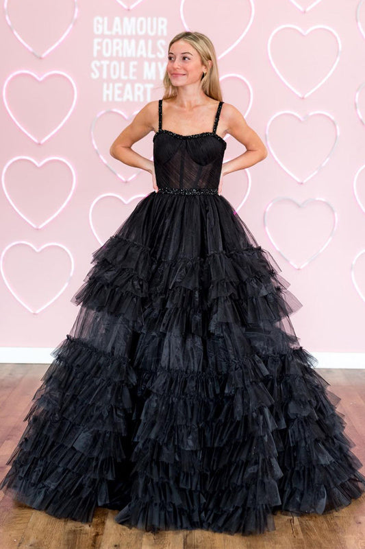 Romantic Ball Gown Straps Black Ruffle Tiered Tulle Prom Dress with Beading LD062574