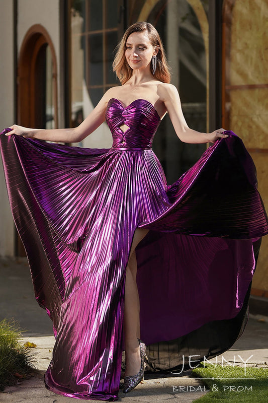 Jovie | Hot Pink Strapless Pleated Long Prom Dress with Slit