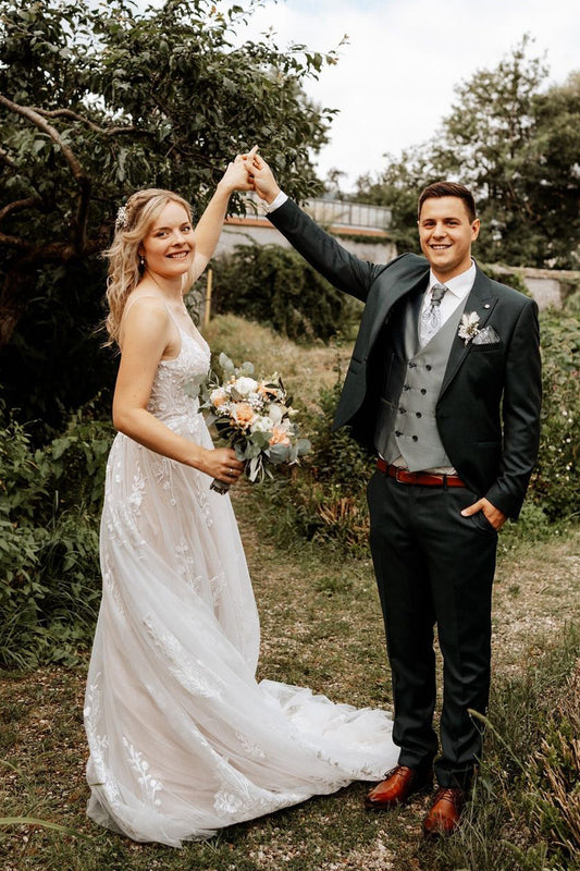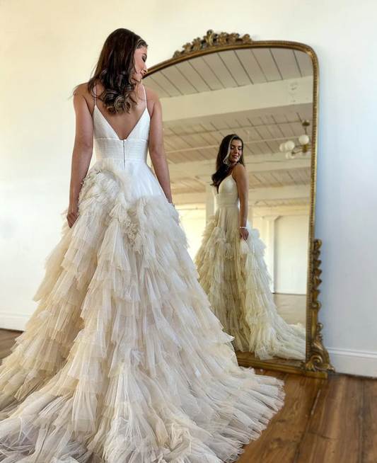 White A-Line Tulle Prom Dress with Deep V-Neck and Tiered Skirt