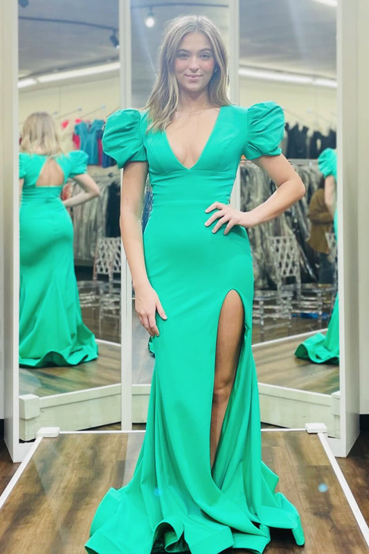 Vivienne | Elegant V-Neck Green Satin Sheath Long Prom Evening Dress