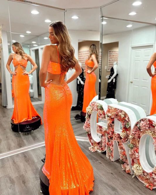 Vibrant | V-Neck Orange Sequin Mermaid Long Prom Dress