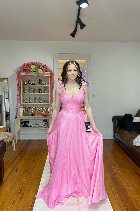 Pink V-Neck Pleated Chiffon A-Line Long Prom Dress