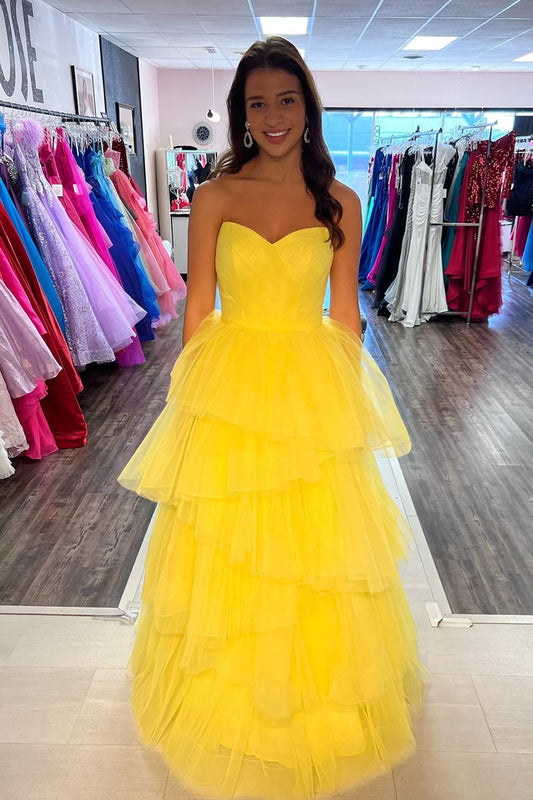Sunny | Strapless Yellow Tulle Tiered Ball Gown Prom Dress