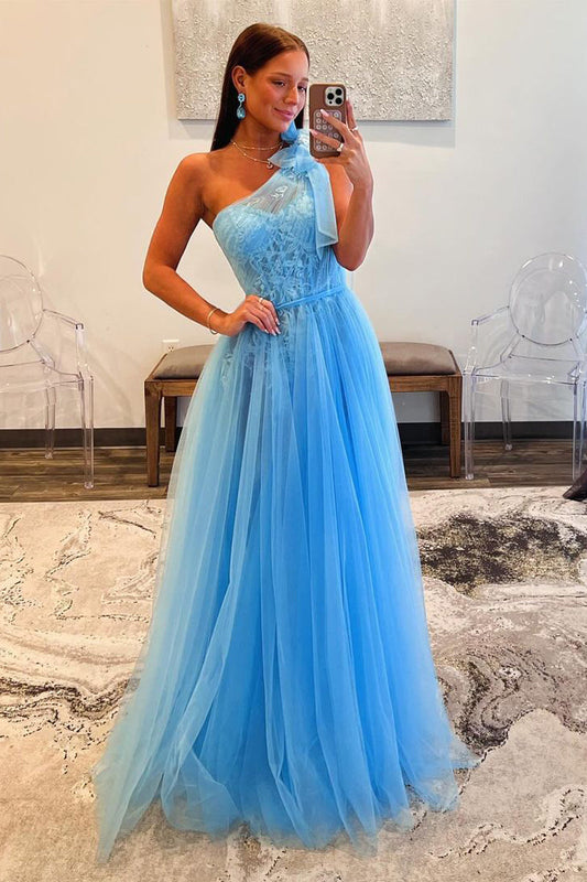 Charming A Line One Shouledr Blue Tulle Long Prom Dress with Appliques LD062556