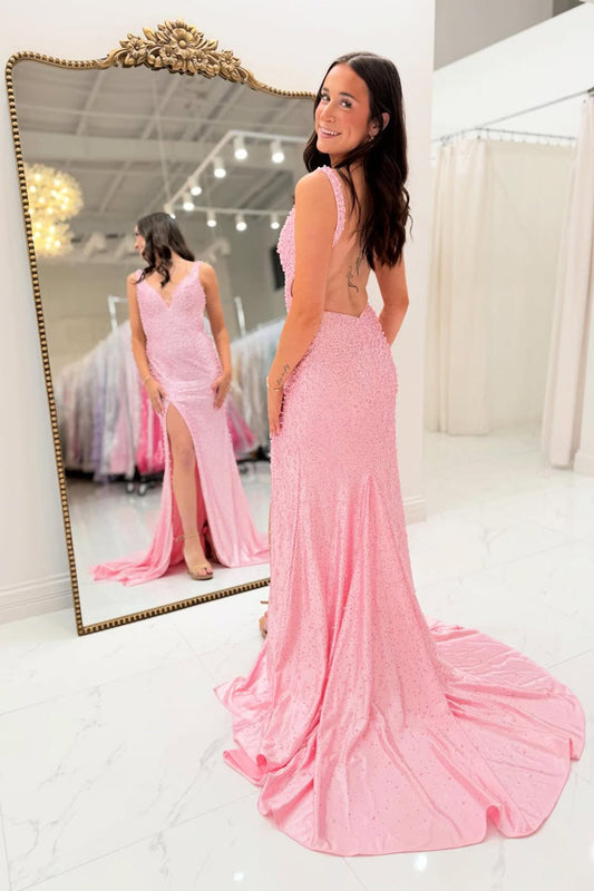 Mermaid V Neck Pink Beaded Long Prom Dresses with Slit LD26012901