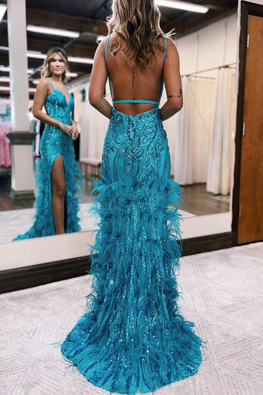 Mermaid V Neck Jade Sequins Long Prom Dresses with Feather LD070822