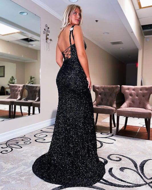 Mermaid One Shouldr Black Sequins Long Prom Dresses with Star Beading LD063004