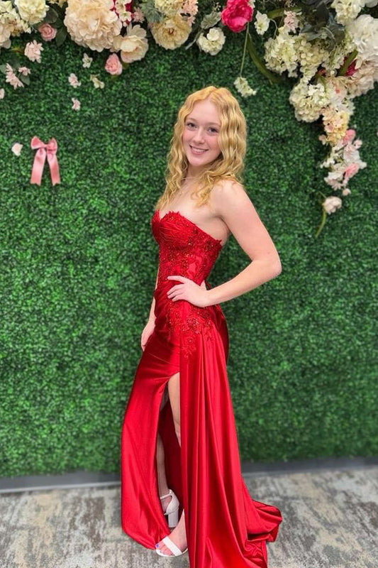 Elegant Mermaid Red Satin Prom Dress with Sweetheart Neckline and Appliques