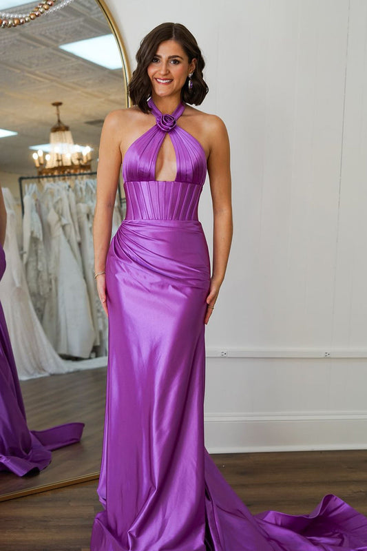 Elegant Mermaid Light Purple Satin Prom Dress with Halter Neckline and Bow Detail