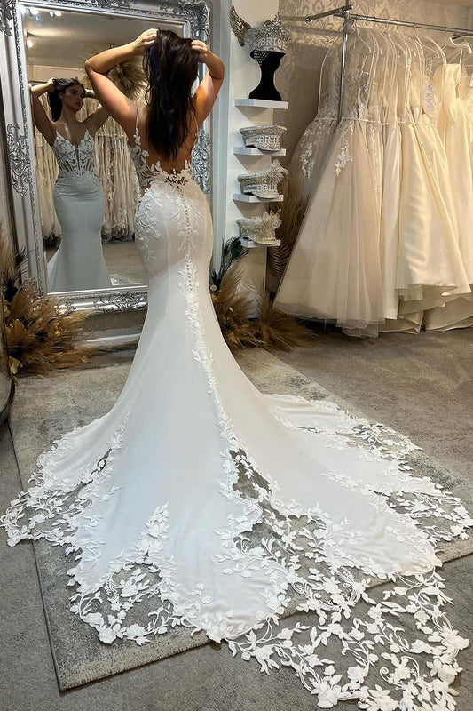 Romantic Mermaid V-Neck Lace Wedding Dress with Appliques - Beach Bride Dress