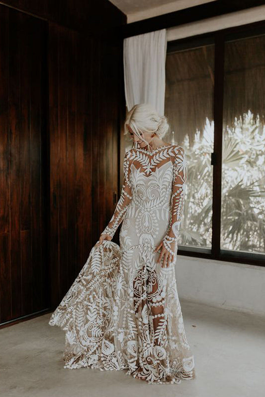 Gorgeous Mermaid V Neck Long Sleeves Lace Beach Wedding Dress Two Piece LD062401