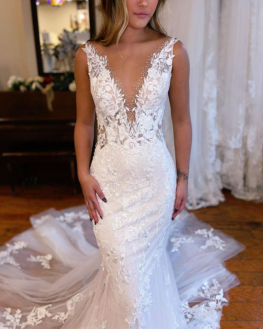 Charming Luxurious Mermaid V Neck Lace Wedding Dresses with Appliques LD062508
