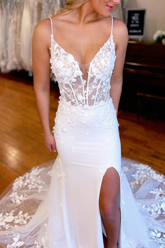 Elegant Mermaid V Neck Lace Wedding Dresses with Appliques LD062521