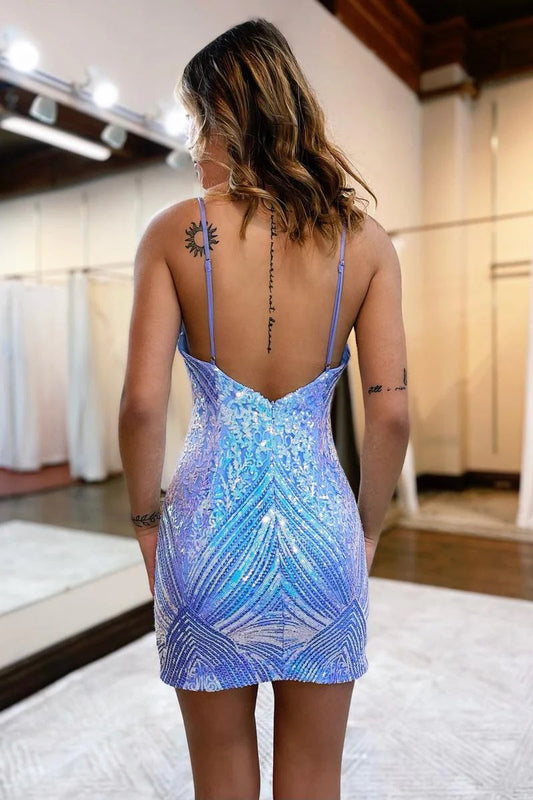 Cute Bodycon V Neck Blue Sequins Lace Homecoming Dresses LD0625128