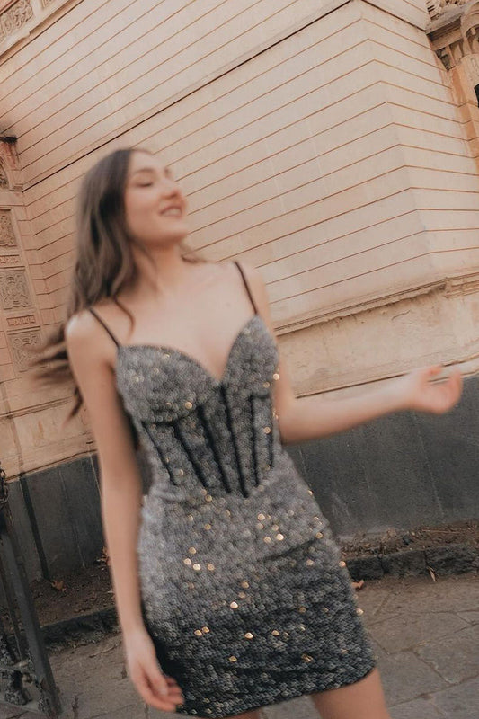 Cute Bodycon V Neck Black Sparkly Short Homecoming Dresses LD0625115