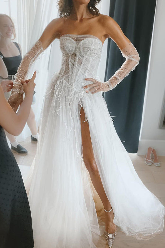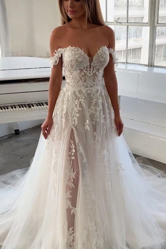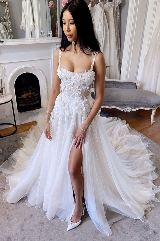 Fairy A Line Sweetheart Tulle Slit Wedding Dresses with Appliques LD062525