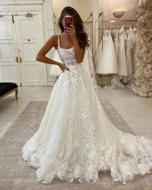 Gorgeous A Line Square Neck Tulle Wedding Dresses with Appliques LD070501